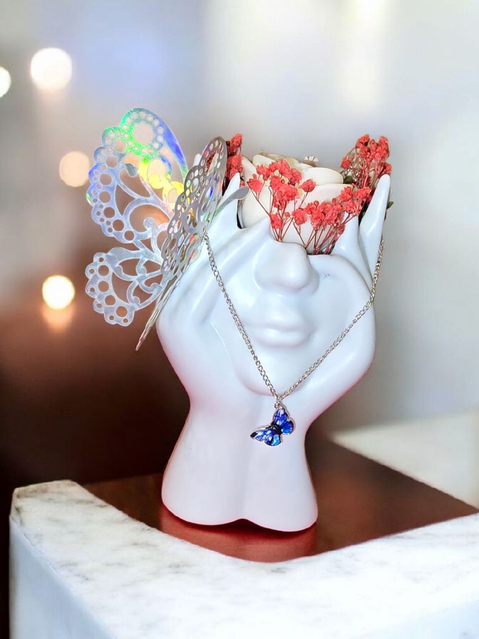 De plus, chaque bouquet inclut un collier papillon offert. Ce détail apporte une touche supplémentaire et renforce l’effet surprise. Ainsi, le produit devient immédiatement prêt à offrir.